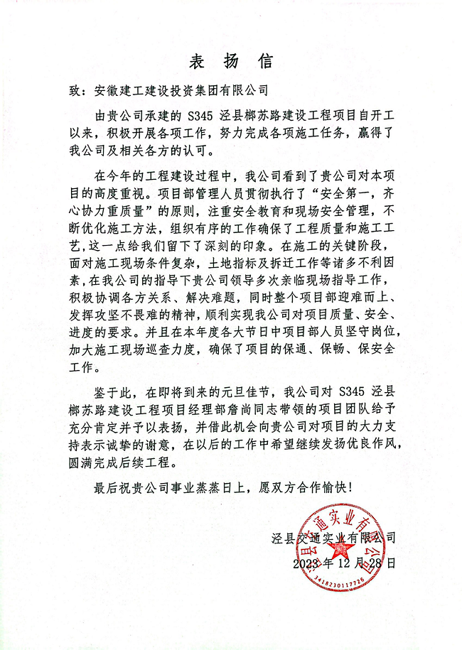 近日,建工建投集團(tuán)S345涇縣榔蘇路項(xiàng)目收到業(yè)主單位涇縣交通實(shí)業(yè)有限公司來信表揚(yáng)。信中對S345涇縣榔蘇路項(xiàng)目積極開展各項(xiàng)工作,努力完成各項(xiàng)施工任務(wù)給予充分肯定和表揚(yáng)。