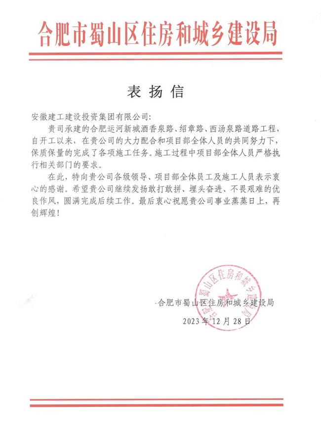 表揚(yáng)信中指出,建工建投集團(tuán)承建的合肥運河新城酒香泉路、紹章路、西湯泉路道路工程自開工以來,在公司的大力配合和項目部全體人員的共同努力下,保質(zhì)保量地完成了各項施工任務(wù)。施工過程中,項目部全體人員一直延續(xù)優(yōu)良傳統(tǒng),發(fā)揮較高的管理水平,進(jìn)度質(zhì)量齊頭并進(jìn),嚴(yán)格執(zhí)行相關(guān)部門的要求,圓滿完成了工作。