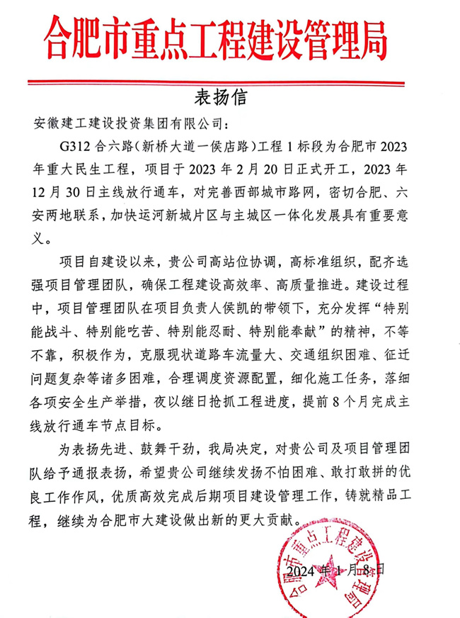 1月8日,建工建投集團(tuán)收到合肥市重點(diǎn)局來信表?yè)P(yáng)。信中對(duì)建工建投集團(tuán)及G312合六路(新橋大道-侯店路)項(xiàng)目管理團(tuán)隊(duì)提前8個(gè)月完成主線放行通車節(jié)點(diǎn)目標(biāo)予以充分肯定和表?yè)P(yáng)。