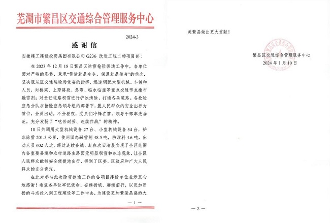 1月11日,繁昌區G236改造工程項目部收到繁昌區交通綜合管理服務中心送來的感謝信,信中對繁昌區G236改造工程項目部在強降雪天氣中,高效的除雪搶通工作表達了充分肯定,并致以衷心的感謝。