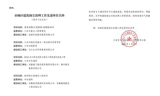 1月12日,G312合六界至迎賓大道交口段快速化改造工程項目部收到六安市大氣污染防治工作領導小組的通報表揚文件。因G312合六界至迎賓大道交口段快速化改造工程項目在深入打好六安市藍天保衛戰深度治理各類建筑揚塵工作中做出了顯著成績,喜獲通報表揚。