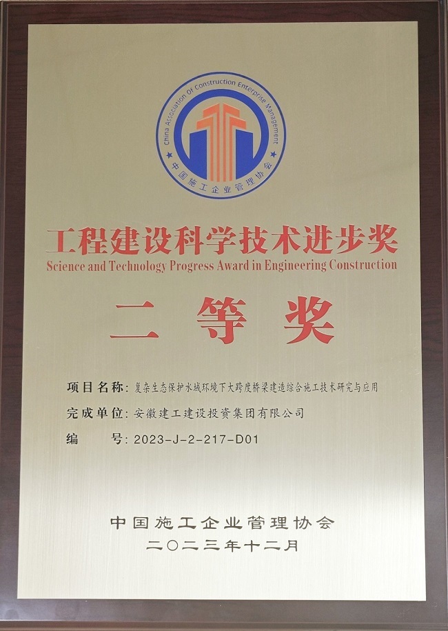 近日,2023年度中國工程建設科學技術進步獎頒獎大會在北京召開,由安徽建工建設投資集團牽頭的“復雜生態保護水域環境下大跨度橋梁建造綜合施工技術研究與應用”項目榮獲2023年度工程建設科學技術進步獎二等獎。