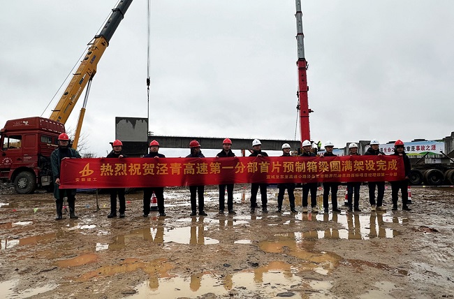 1月18日上午,涇青高速一分部徽水河大橋首片25m箱梁穩(wěn)穩(wěn)落在蓋梁上,標(biāo)志著涇青高速公路全線第一片箱梁圓滿架設(shè)完成。涇青高速一分部由此進(jìn)入了新的施工階段,箱梁安裝作業(yè)全面展開(kāi),為項(xiàng)目全年節(jié)點(diǎn)目標(biāo)的實(shí)現(xiàn)奠定了堅(jiān)實(shí)的基礎(chǔ)。