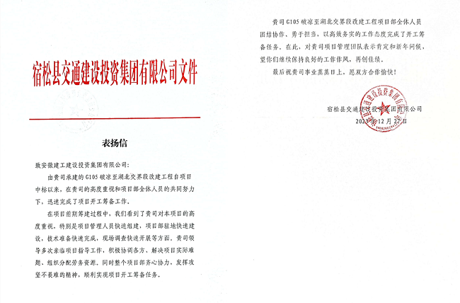 近日,安徽建工建設(shè)投資集團(tuán)G105破涼至湖北交界段改建工程項(xiàng)目部收到宿松縣交通建設(shè)投資集團(tuán)有限公司發(fā)來的表揚(yáng)信,信中對公司承建的G105項(xiàng)目管理團(tuán)隊(duì)表示肯定并致以新年的問候。