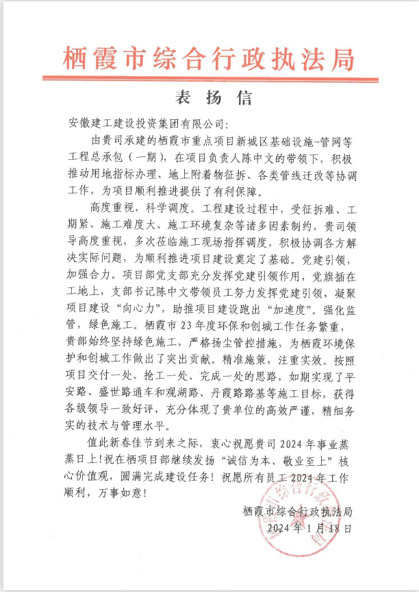 1月18日,棲霞市新城區基礎設施管網項目收到棲霞市綜合行政執法局發來的表揚信,信中對項目管理團隊的工作予以充分肯定和表揚,對建工建投集團的大力支持表示誠摯感謝。