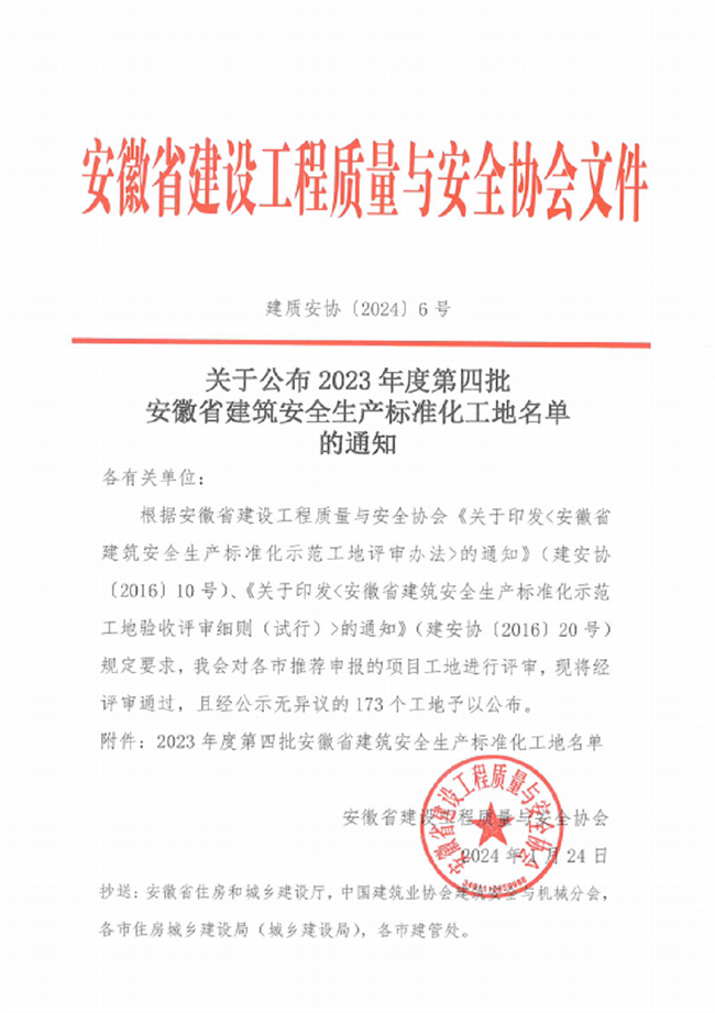 近日,安徽省建設(shè)工程質(zhì)量與安全協(xié)會公布了第四批安徽省建筑安全生產(chǎn)標(biāo)準(zhǔn)化工地名單,公司承建的金寨路高架橋綁寬(南二環(huán)-習(xí)友路)工程、新站高新區(qū)鶴翔湖路等五條路工程、G312合六路(新橋大道—侯店路)工程施工1標(biāo)段、白馬山路(學(xué)林路-關(guān)井路)等三條道路建設(shè)工程施工1標(biāo)段獲評本次標(biāo)準(zhǔn)化工地冠名。