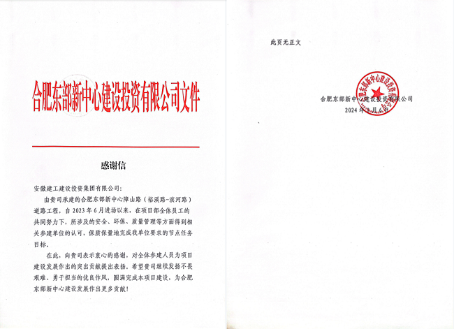 2月6日,合肥東部新中心障山路項目收到合肥東部新中心建設投資有限公司發(fā)來的感謝信,信中對項目管理團隊的工作予以充分肯定和表揚,對建工建投集團的大力支持表示誠摯的感謝。