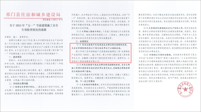 近日,祁門縣住建局發(fā)布《關(guān)于2024年“五一”節(jié)前建筑施工安全專項檢查情況的通報》,對祁門電商物流產(chǎn)業(yè)園項目予以通報表揚。