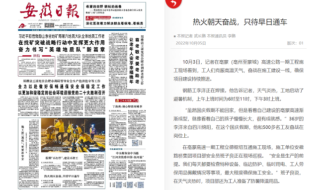10月5日,《安徽日報》頭版以《熱火朝天奮戰,只待早日通車》為題,報道路橋集團項目亳蒙高速建設者克服高溫天氣,奮戰在施工建設一線,確保項目建設持續推進的奮斗場面。稿件獲中安在線、安徽青年網、亳州新聞網等主流媒體轉載。
