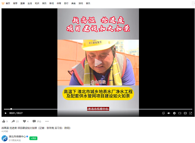 7月24日,淮北市廣播電視臺視頻號“淮北市傳媒中心”報道淮北市供水管網(wǎng)項目在高溫天氣戰(zhàn)高溫,搶進度,項目建設(shè)如火如荼的場面。