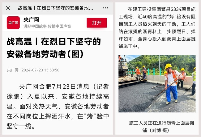 報道中指出:在建工建投集團繁昌S334項目施工現(xiàn)場,近40度高溫的“烤”驗沒有阻擋施工人員熱火朝天的干勁,工人們站在滾燙的瀝青料上,頭頂烈日、揮汗如雨,全身心投入到瀝青上面層攤鋪施工中。