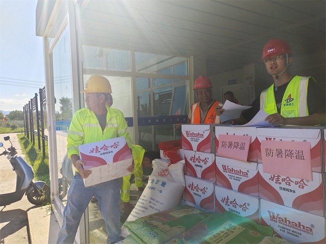 為了確保建筑工人的身體健康和施工安全,項目部高度重視防暑降溫工作,提前制定了詳細的防暑降溫方案。項目部實行“抓兩頭、歇中間”的作息制度,讓工人們能夠在相對涼爽的時間段進行作業。在施工現場,項目部設置了多個防暑降溫休息點,配備了充足的飲用水、綠豆湯、西瓜、藿香正氣水等消暑“神器”,保障一線建設者度過高溫天氣。