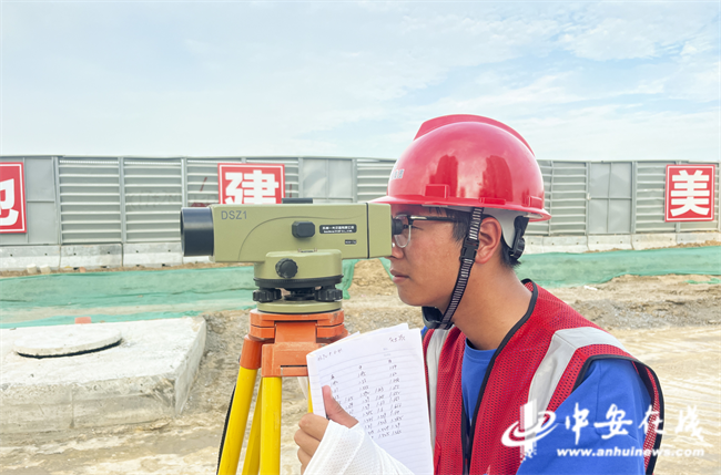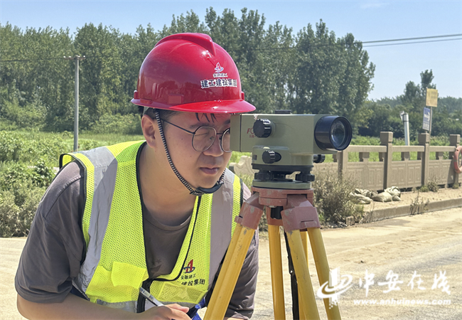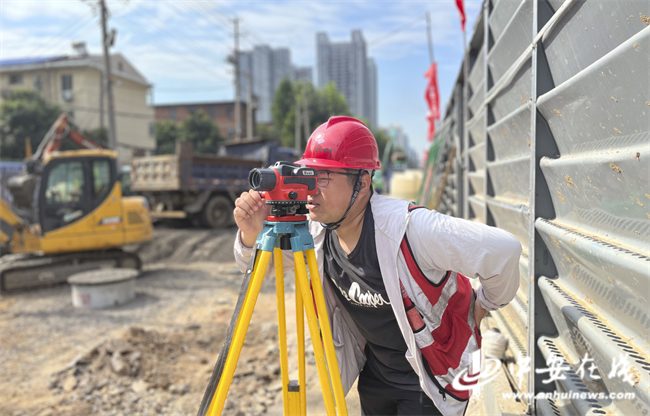 在烈日炙烤和酷暑考驗下,合肥市楊崗路、幸三路等 2 條道路項目現場技術人員冒著酷暑,使用水準儀精確測量和復核管道開挖的高程,確保施工質量與安全。施工現場嚴格實施錯峰施工與全面防暑降溫各項舉措,保障施工人員健康安全,確保各項目施工有序安全平穩推進。