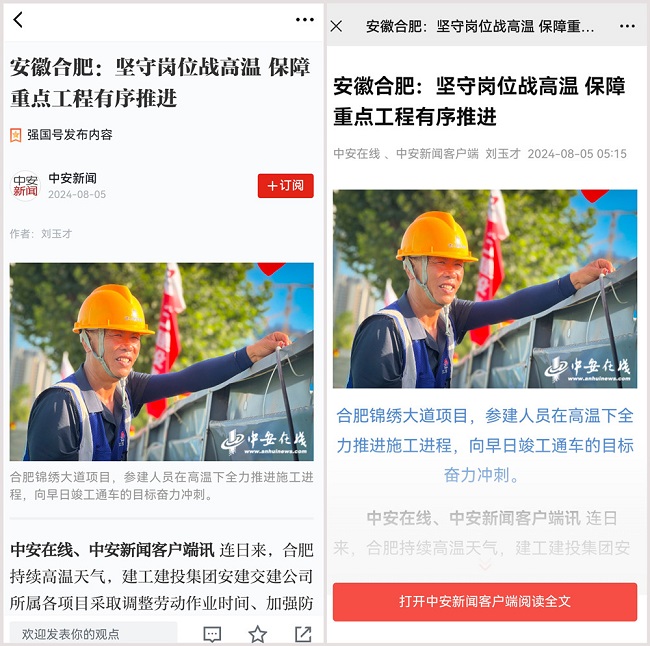 連日來,合肥持續高溫天氣,學習強國、中安在線報道建工建投集團安建交建公司所屬各項目采取調整勞動作業時間、加強防暑降溫等措施,保障重點工程建設有序推進。