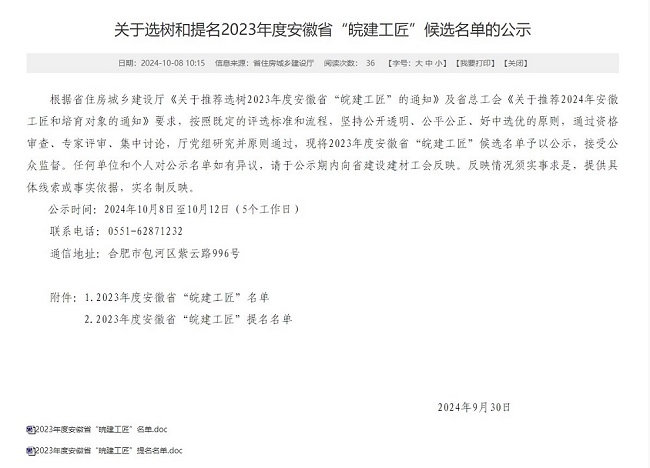 近日,安徽省住房和城鄉建設廳發布2023年度安徽省“皖建工匠”候選名單,建工建投集團姚啟海被命名為“皖建工匠”,李健獲“皖建工匠”提名。