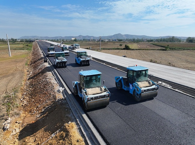徐淮阜高速項目施工現場熱火朝天,建工建投設備租賃公司智能化攤壓設備正在夜以繼日的進行無人駕駛攤壓施工。