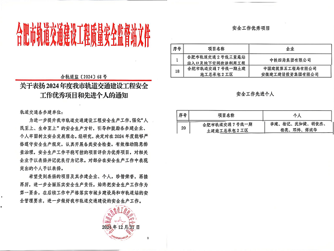 近日,合肥市軌道交通建設工程質量安全監督站發來《關于表揚2024年度我市軌道交通建設工程安全工作優秀項目和先進個人的通知》,建工建投集團合肥市軌道交通7號線一期土建施工總承包2工區項目榮獲“安全工作優秀項目”稱號,鄧煒、傅斌華榮獲“安全工作先進個人”稱號。