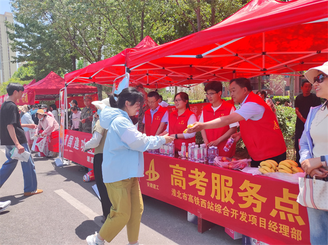 淮北市高鐵西站綜合開發項目在濉溪縣第二中學外搭建起溫馨的服務站,為考生和家長提供各類貼心服務,如礦泉水、防暑物品、水果等。他們以真誠的笑容和細致的關懷,為緊張的高考氛圍增添了溫暖與力量。