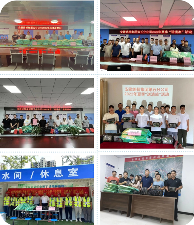 此外,五分公司所屬阜淮高速項目、舒城項目、合廬產業新城項目、G36寧洛高速項目也相繼組織開展為勞務隊伍“送清涼”活動。項目部精心為各施工隊伍配備了藿香正氣水、人丹、綠豆湯以及西瓜、牛奶等防暑降溫藥品和物品,并邀請當地社區衛生院醫務人員前往項目施工現場,為一線工人提供義務血壓測量服務。多措并舉戰高溫、保安全、促生產,在保障工人身心健康的同時,確保高溫天氣下項目安全生產平穩運行。