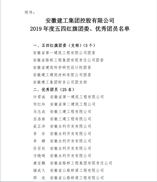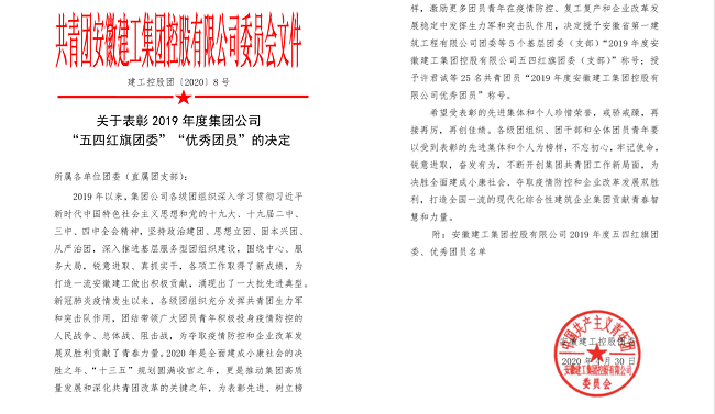 近日,安徽建工控股團(tuán)委下發(fā)《關(guān)于表彰2019年度集團(tuán)公司“五四紅旗團(tuán)委”“優(yōu)秀團(tuán)員”的決定》(建工控股團(tuán)〔2020〕8 號(hào)),對(duì)2019年度表現(xiàn)突出的先進(jìn)團(tuán)組織和先進(jìn)個(gè)人進(jìn)行表彰。路橋集團(tuán)團(tuán)委榮獲“2019 年度五四紅旗團(tuán)委”榮譽(yù)稱號(hào),康寶鵬同志榮獲“優(yōu)秀團(tuán)員”榮譽(yù)稱號(hào)。