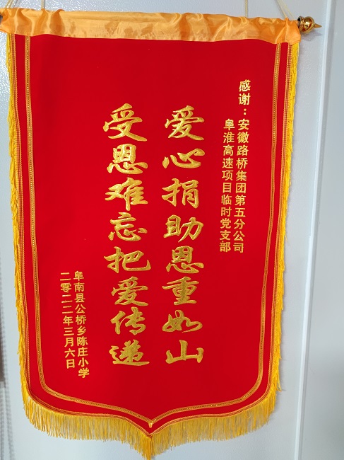 3月25日,阜南縣公橋鄉(xiāng)陳莊小學(xué)將一封感謝信和一面寫有“愛心捐贈(zèng)恩重如山 受恩難忘把愛傳遞”的錦旗送至第五分公司阜淮高速項(xiàng)目臨時(shí)黨支部,以表達(dá)對(duì)項(xiàng)目部愛心助學(xué)行為的感激之情。