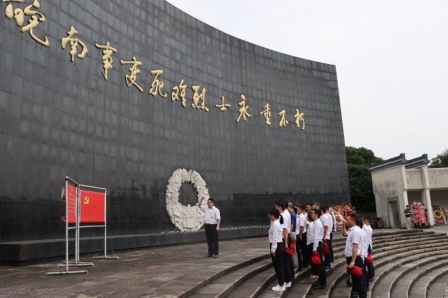 英雄無名,無礙精神長存。緬懷的意義不僅僅在于回望,更在于對英雄靈魂的傳承。在“皖南事變死難烈士永垂不朽”主碑紀念廣場前,全體成員向革命英烈敬獻花籃,并深深三鞠躬。在鮮紅的黨旗下高舉右手,重溫入黨誓詞,叩問入黨初心。