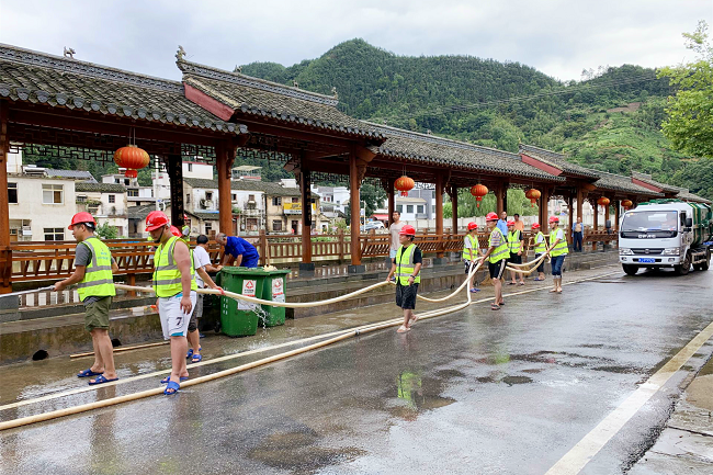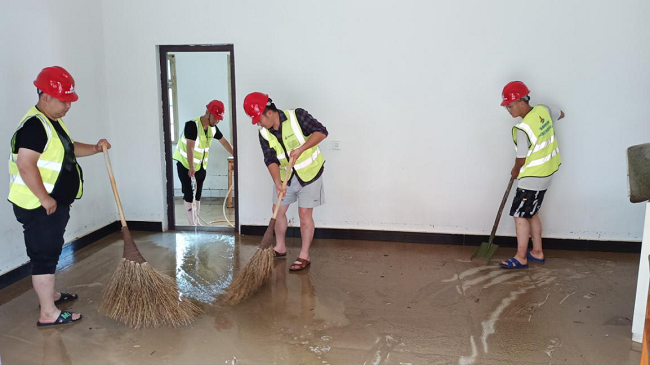 7月9日,洪水退后,當地政府組織災后自救工作。項目部再一次集體出動,深入受災現場,積極主動參與武陽村及武陽鄉街道災后恢復工作。