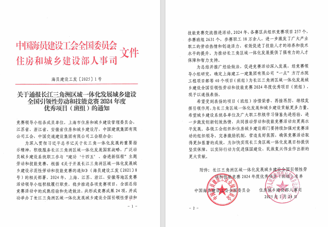 近日,中國海員建設工會印發《關于通報長江三角洲區域一體化發展城鄉建設全國引領性勞動和技能競賽2024年度優秀項目(班組)的通知》,安徽建工建設投資集團有限公司徐州至淮北至阜陽高速公路宿州段路基01標項目榮獲2024年度優秀項目榮譽稱號