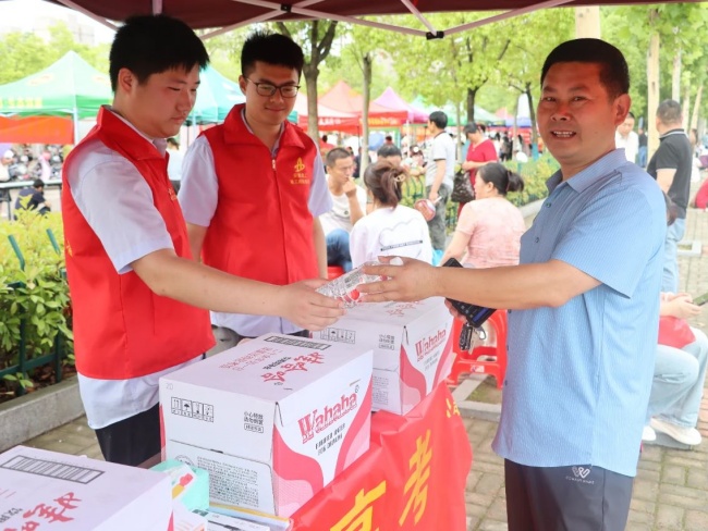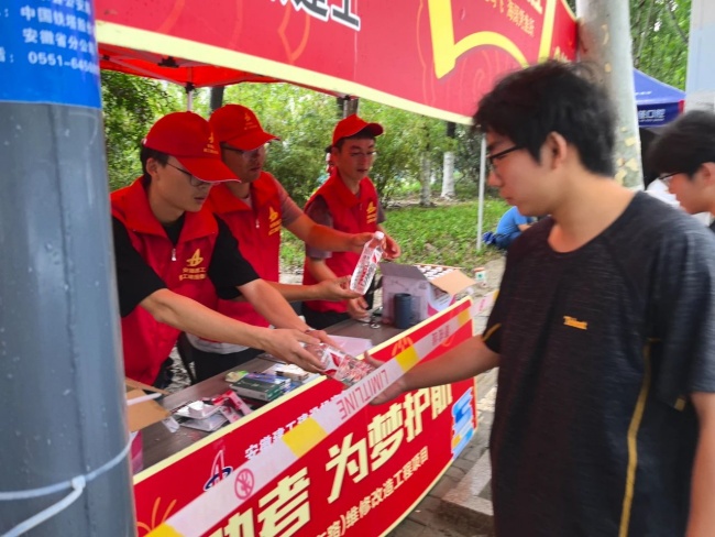 淮北市高鐵西站綜合開發項目在濉溪縣第二中學考點外,精心搭建起溫馨服務站,為考生和家長提供礦泉水、水果等物資,幫助大家在炎炎夏日補給水分,補充營養。