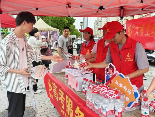 搭建納涼帳篷、擺放便民桌椅,懸掛勵志旗幟與橫幅營造溫馨氛圍,寧九高速項目在望江縣二中考點外現場設置“愛心補給站”,為考生及家長提供礦泉水、蘇打水、早餐奶、文具袋、防暑用品等物資。