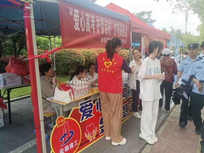 龍城路(金陽路-臨河東路)維修改造工程項目部志愿者們在合肥市通用技術學校考點外搭建遮陽棚,為考生們和家長提供臨時休息區,溫馨提醒往來考生檢查考試必需品及相關證件,還準備了多品類文具、飲用水、紙巾等,以備考生不時之需。