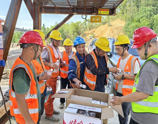 淮桐高速05標項目向土方隊、橋面系、拌合站、防護排水等13個一線施工班組發放包含清涼飲品、綠豆等防暑降溫物資。同時,項目部每日配送解暑酸梅湯、礦泉水等防暑物資至各施工作業點,切實將安全生產與人文關懷落到實處。