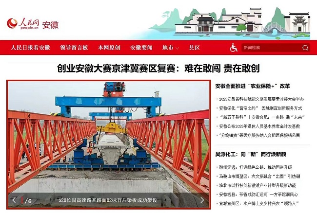 2025年10月15日,建工建投集團S20長固高速路基路面02標首片梁板成功架設。人民網記者深入項目一線展開報道,稿件登上人民網安徽頻道首頁。