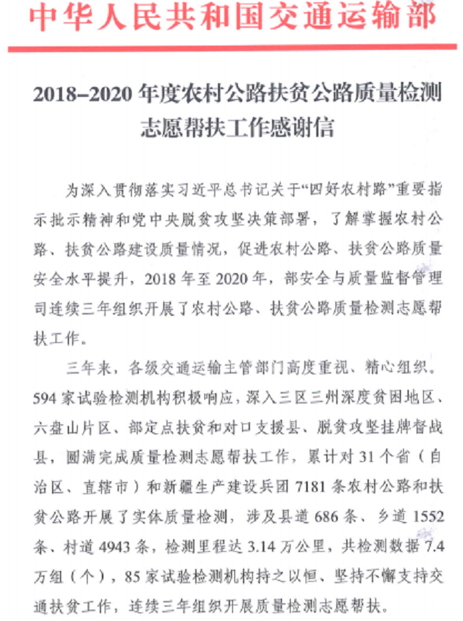 近日,交通運(yùn)輸部對(duì)參加扶貧檢測(cè)工作單位的公開感謝信中,檢測(cè)公司名列其中。