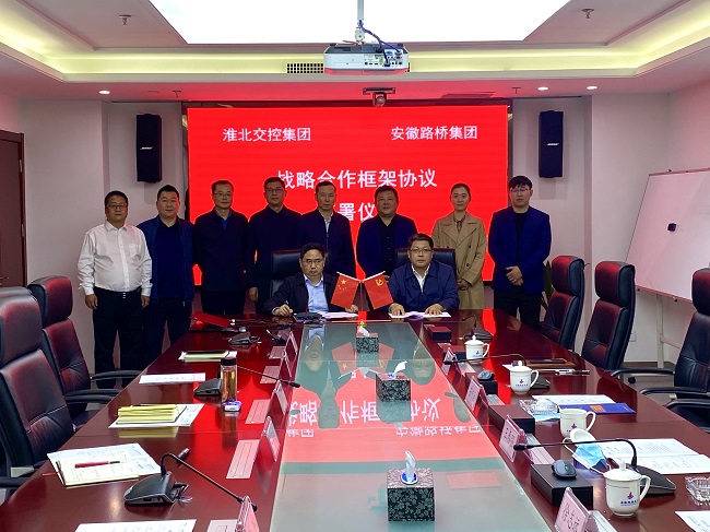 10月15日上午,安徽路橋集團與淮北交控集團戰略合作框架協議簽約儀式在合肥舉行。公司黨委書記、董事長盛明宏,黨委副書記、總經理歐陽志宜,黨委委員、副總經理盧軍球,淮北交控集團董事長苗中治,總經理王春強,副總經理戚曉靜等出席簽約儀式。