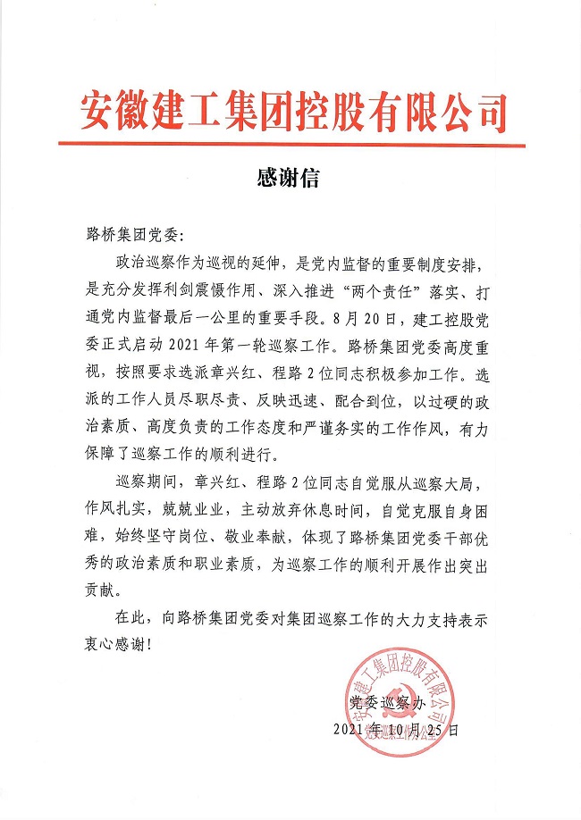 近日,建工控股黨委巡察辦發(fā)來感謝信,對(duì)公司在集團(tuán)開展的2021年第一輪巡察工作期間,提供的高質(zhì)量服務(wù)保障和作出的突出貢獻(xiàn)表示感謝。
