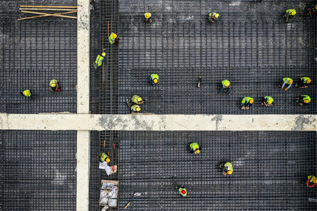 在安徽路橋集團承建的濱湖科學城花園大道項目工地上,記者看到塔吊林立,車輛來回穿梭,機器轟鳴作響,幾十名施工人員正緊鑼密鼓地進行中板鋼筋綁扎作業。