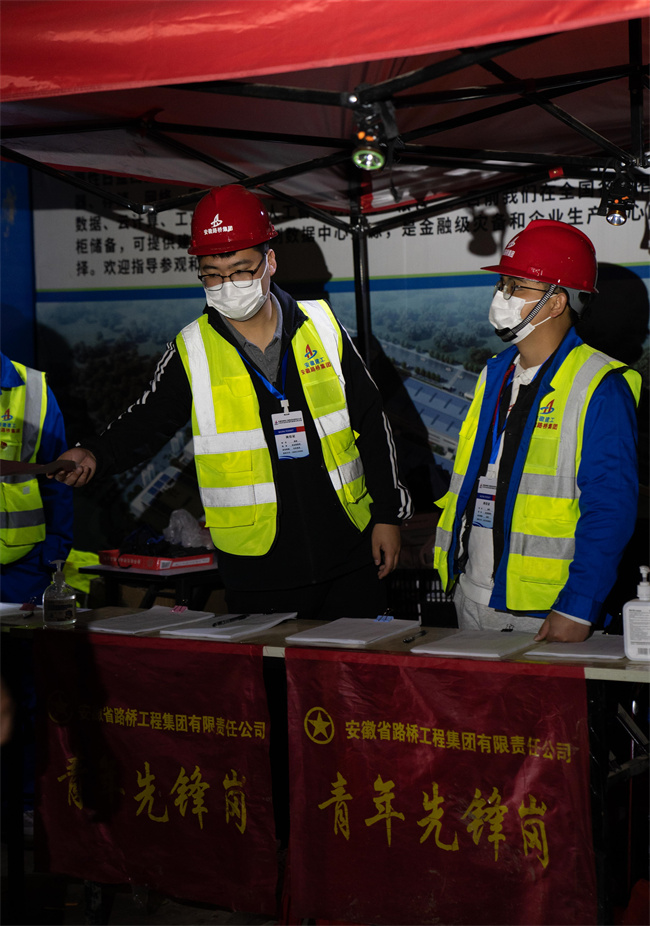 隔離點現(xiàn)場有12家勞務單位同時作業(yè),1500余名工人穿插施工,人員集中,流動性大,防疫管控面臨巨大挑戰(zhàn)。為確保建設者健康安全,項目實行封閉式管理,建立“一人一檔、一日一檢”模式。后勤保障組24小時守衛(wèi)項目門口“安全線”,對所有進場人員及車輛進行登記、消殺,保障全體參建人員健康。