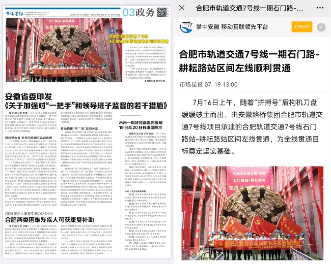 7月16日上午,隨著“拼搏號”盾構機刀盤緩緩破土而出,由安徽路橋集團承建的合肥軌道交通7號線石門路站至耕耘路站區間左線貫通,為該線貫通的第6條盾構單線區間。