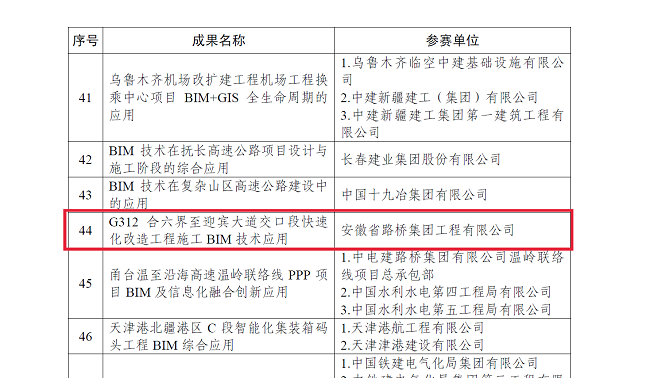 近日,中國施工企業管理協會公布了第三屆工程建設行業BIM大賽獲獎名單,由安徽路橋集團BIM中心申報的《G312合六界至迎賓大道交口段快速化改造工程施工BIM技術應用》榮獲大賽三等獎!