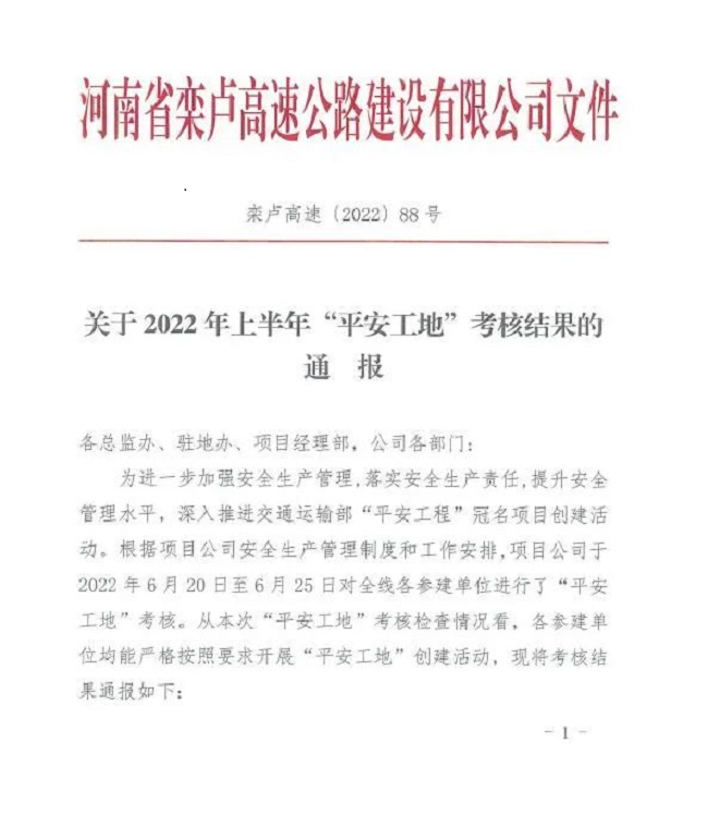 近日,河南省欒盧高速建設(shè)有限公司組織欒盧高速項(xiàng)目6個(gè)標(biāo)段開展2022年上半年平安工地考核,安徽路橋集團(tuán)欒盧高速03標(biāo)段喜獲全線“第一名”的傲人成績(jī),有力彰顯了公司企業(yè)形象。