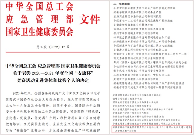 近日,中華全國總工會、應急管理部、國家衛生健康委員會聯合發文《關于表彰2020-2021年度全國安康杯競賽活動先進集體和優秀個人的決定》,安徽路橋集團包公大道(二十埠河-龍興大道)道路及管廊工程-3標項目榮獲2020-2021年度全國“安康杯”競賽活動優勝班組榮譽稱號,這是公司首次獲該項國家級榮譽。